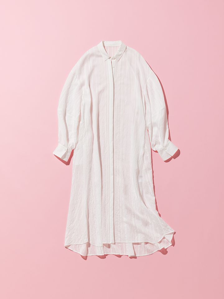 ワンピースとしても羽織りとしても使える着回し力抜群の1枚。体に気のなる部分を露出することなく、シャツ特有のシャープな印象でスッキリ見えが叶います。ほんのり透ける素材で抜け感も出せるので、女性らしさも演出できます。ワンピとして着るなら、ヌーディーなサンダルやオシャレビーサンでちょっぴりリゾート的に、ランチシーンなら前を開けて、タンクトップをインナーにデニムとバーサンダルでカッコよく着るのも素敵。何を着ようかと迷ったときに1枚あれば、コーデが浮かびそうなシャツワンピースです。 ワンピース¥39,600(styling//styling/ ルミネ新宿1店)