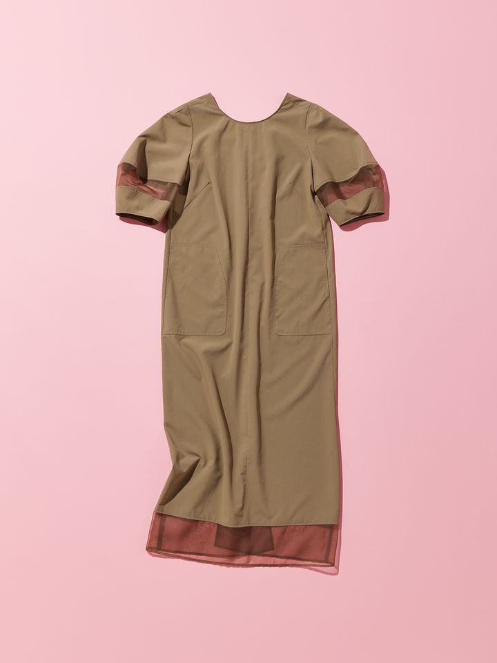肌見せやシアーが今のトレンドでもありますが、このワンピは部分透けであることで、肌見せに多少抵抗があるけど挑戦してみたいという人にもオススメです。大胆な透けではなくさり気ないので、品格もあり、着ていけるシチュエーションも広がるのがメリットです。ママ友とのランチからちょっとした華やかなパーティまで振り幅の広さが魅力。さらにIラインを作るシルエットなので、ワンピの丈感に悩むSサイズさんにも縦長効果を発揮し、体型カバーという視点でも優秀です。 ワンピース¥26,400(ルーニィ)