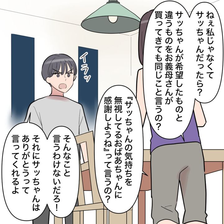 「ねぇ私じゃなくてサッちゃんだったら?サッちゃんが希望したものと違うものをお義母さんが買ってきても同じこと言うの?『サッちゃんの気持ちを無視してるおばあちゃんに感謝しようね』って言うの?」私の気持ちが微塵も分からないショウタに、サッちゃんに置き換えて言うと、ショウタはイラつき始めました。「そんなこと言うわけないだろ!それにサッちゃんはありがとうって言ってくれるよ。」