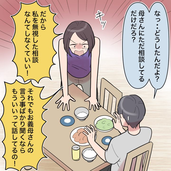 ショウタは「どうしたんだよ?母さんにただ相談してるだけだろ?」と、怒り出した私がおかしいみたいな言い方。「だから私を無視した相談なんてしなくていい!」と私は抑えきれずに怒鳴りました。いつも相談なんかじゃなくて、2人で決めたことなのに何でも義母に話、義母の思い通りに勝手に変えていくだけ。「それでもお義母さんの言う事ばかり聞くならもういいって話してるの!」訴えました。