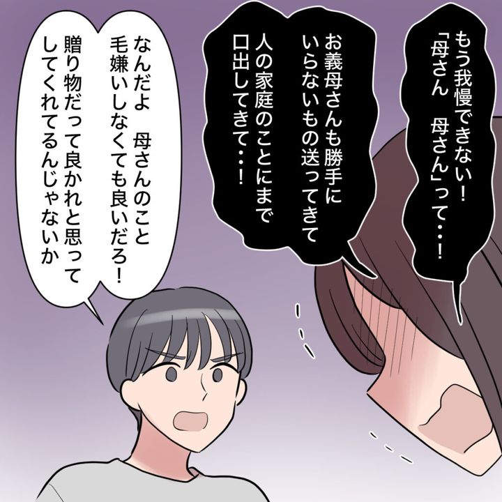ショウタが「母さん、母さん」とばかり言う事にもう我慢できませんでした。「お義母さんも勝手にいらないもの送ってきて、人の家庭のことにまで口出ししてきて・・・!」言いかけると、自分の母親を悪く言われたショウタはムッとして「なんだよ、母さんのこと毛嫌いしなくてもいいだろ!贈り物だって良かれと思ってしてくれてるんじゃないか」と言いました。
