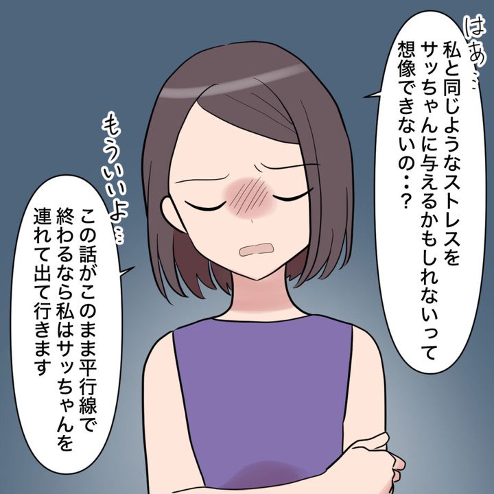 私は、これ以上ショウタと話しても無駄だと思うと、ため息が出ました。「私と同じようなストレスをサッちゃんに与えるかもしれないって想像できないの?」もういい、そう思った私は「この話がこのまま平行線で終わるなら、私はサッちゃんを連れて出て行きます。」と心を落ち着け、静かに言いました。