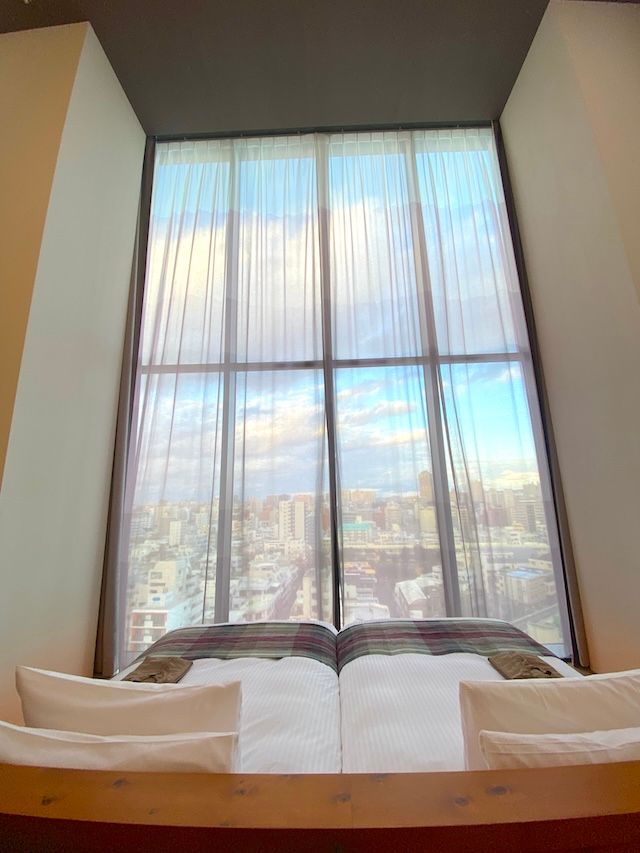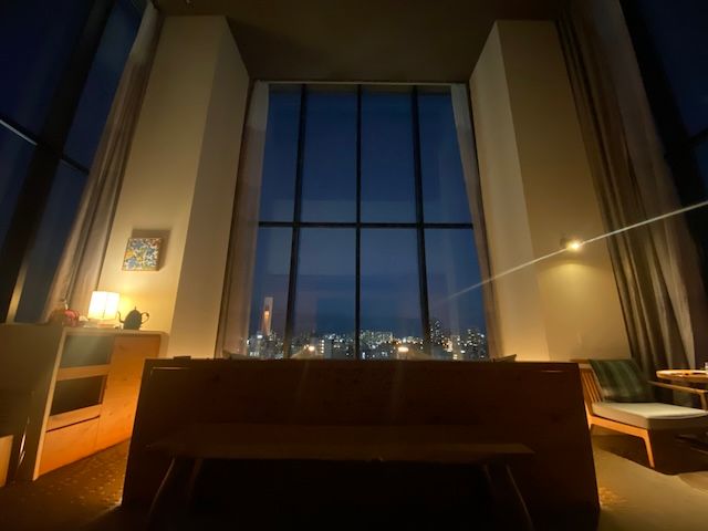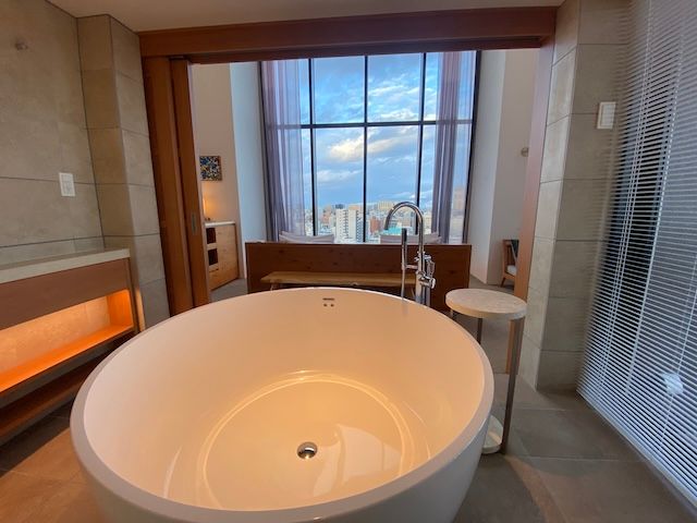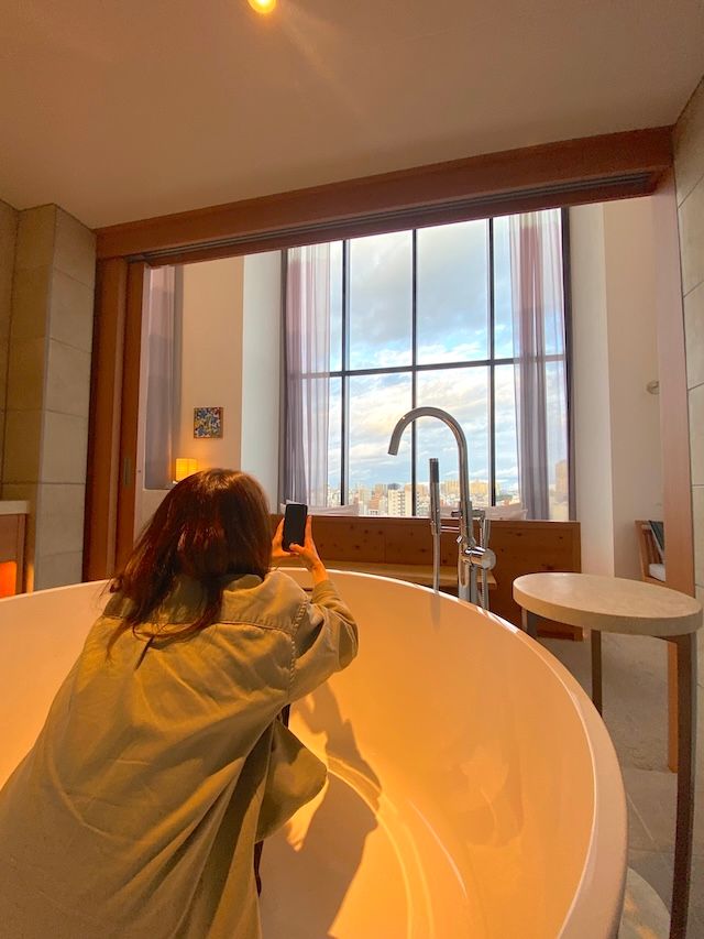 この天空のパノラマスイート、「せっかく宿泊したならきれいに撮影したい!」宿泊してみて気づいた撮影ポイントをご紹介します。それは、バスタブに入って撮影すること。高さのある3面窓がとても大きく、この解放感を表現するためには工夫が必要です。