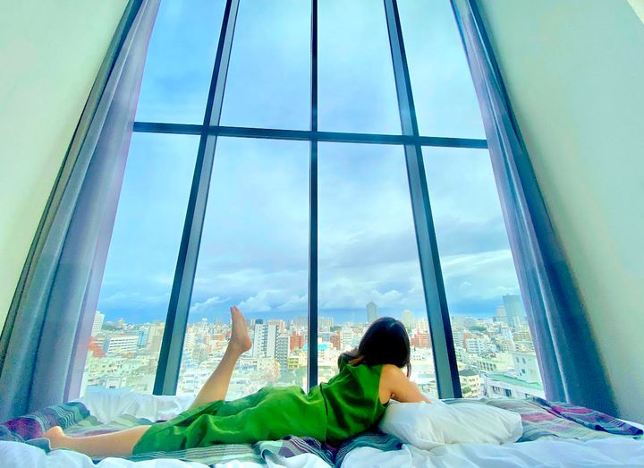 ベッドの後ろにあるバスルームの扉を開け、バスタブに入って撮影すると、天空にいるような撮影が可能です。筆者のおすすめは早めのチェックイン。お風呂に入る前に撮影を済ませると、スムーズな撮影と宿泊をすることができます。