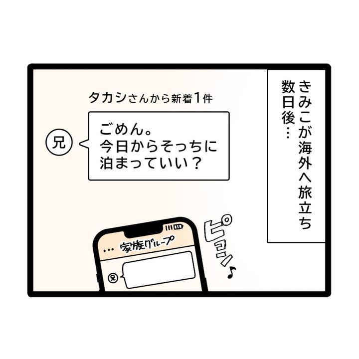 そして、きみこが海外へ旅立ってから数日後のこと。「タカシ:ごめん。今日からそっちに泊まっていい?」兄から一件のメッセージが送られてきました。