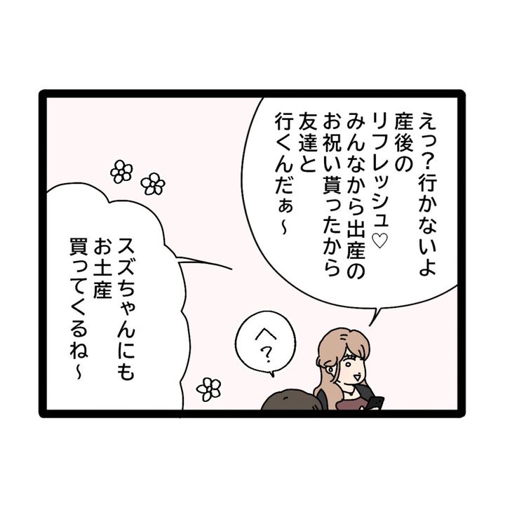 「えっ?行かないよ。産後のリフレッシュ。みんなから出産のお祝い貰ったから、友達と行くんだぁ~」と嬉しそうなきみこに「へ?」と思わず呟く私。「スズちゃんにもお土産買ってくるね~」平然ときみこが言いました。