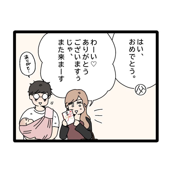 そして、「はい、おめでとう」お父さんが出産祝いを渡すと、「わーい!ありがとうございますぅ。じゃ、また来まーす」嬉しそうに祝儀袋を持つきみこと、妃をしっかり抱っこして「ありがと・・」と呟いて帰って行く兄。