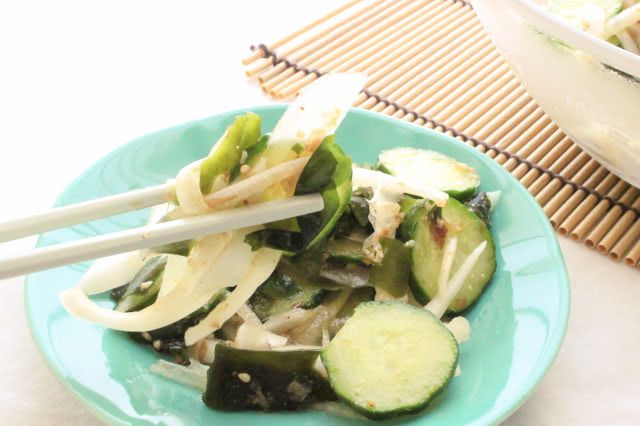 新玉ねぎがたっぷりと入ったきゅうりとわかめの酢の物という見た目ですが、お味はいかがでしょう。