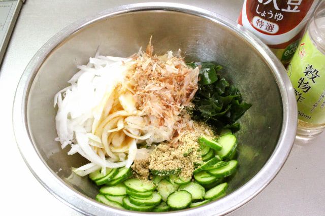 4. 2の砂糖揉みきゅうりに、1の新玉ねぎ、3のわかめ、しょうゆ、酢、かつお節、白ゴマを加えて、全体をサッと混ぜ合わせます。