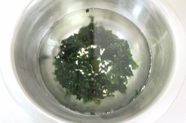 乾燥わかめを水で戻します。水に浸けすぎると味が抜けるので、5分経ったらサッと洗い、水気をしっかりと切りました。