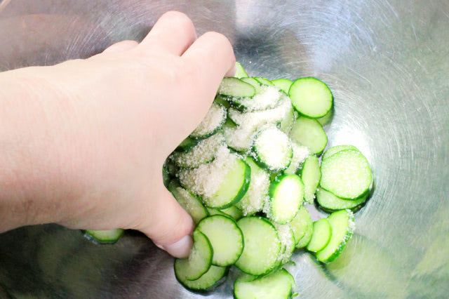 砂糖で揉み、きゅうりの余分な水分を抜くのがポイント。砂糖の浸透圧で、きゅうりの水分が抜けます。砂糖は味付けにもなるので、きゅうりを水洗いする必要はないとのこと。