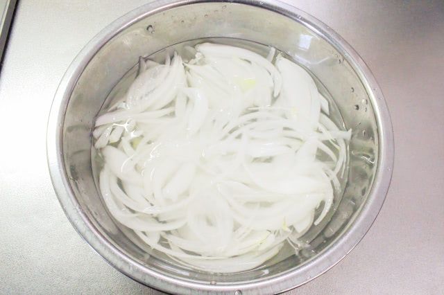 新玉ねぎを広げて空気に晒し、時間をかけて辛味を抜く方法もありますが、時短で作れるよう、水に晒して辛味を抜きます。
