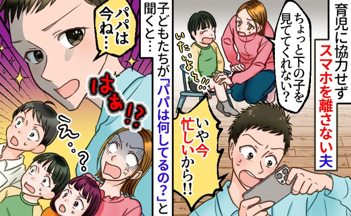 子どもが7歳、5歳、3歳のとき。子育てに奮闘する私は、朝から晩までゆっくりする暇がありませんでした。そんな中、家事や育児を手伝うこともなくスマホに夢中の夫。夜ごはんの支度をするので「下の子の相手をしてくれる?」とお願いしたところ……。