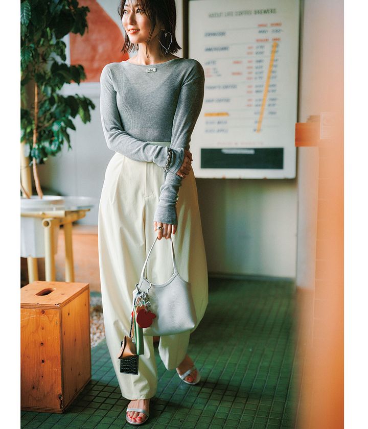 トップス¥18,700(シー/エスストア)パンツ¥23,100(アルページュストーリー/アルページュストーリー プレスルーム)バッグ¥33,000チャーム(参考価格)[10周年記念]〈ともにヴァジック〉リング[左手]¥38,500リング[右手]各¥27,500〈すべてメゾン ヴァジック〉(すべてヴァジックジャパン)靴¥137,500(ジャンヴィト ロッシ/ユナイテッドアローズ 麻布台ヒルズ ウィメンズストア)ピアス¥62,700(ヌゥ ユゥ/アイネックス)ブレスレット¥25,300(シーエックスシー/アマン)