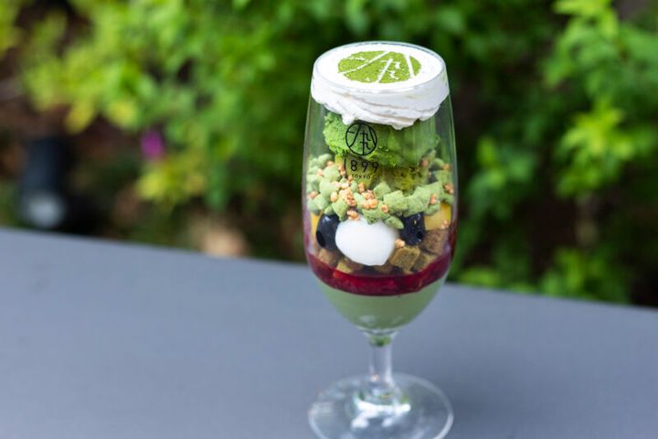 食事のシメに、甘さ控えめの “お茶スイーツ”5品を用意。イチオシは、「お茶パフェ」と「濃茶ジェラート」。抹茶づくしの「1899お茶パフェ」(1,400円)は、自家製の抹茶プリンにベリーソースを重ね、抹茶グラノーラ、濃茶アイス、栗、黒豆、白玉、あんこなどをトッピング。甘みと抹茶の苦みの絶妙なバランスが “シメパフェ”としてオススメです。