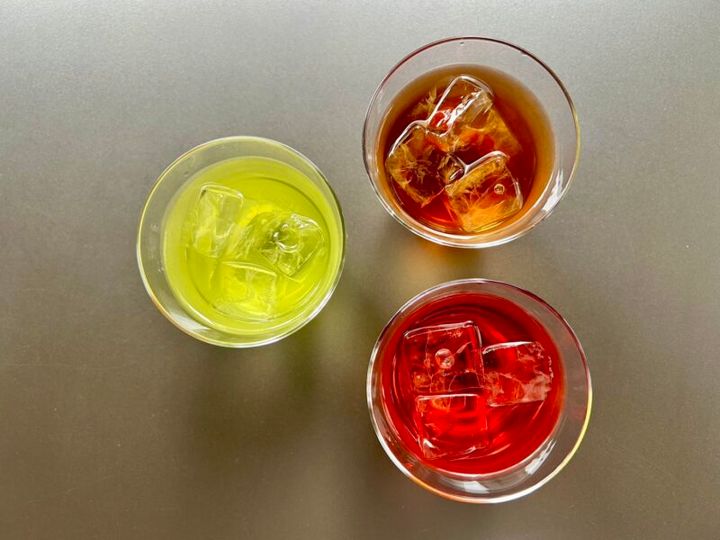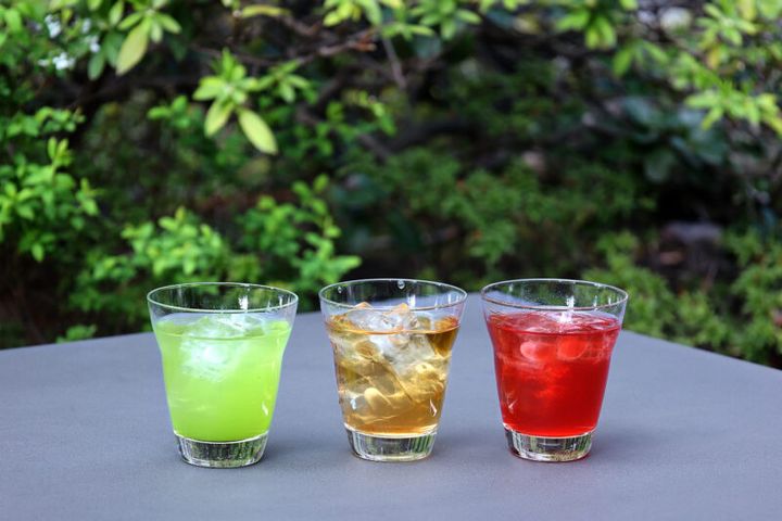 今回のビアガーデンでは、日本茶を使った “お茶カクテル”4種が新登場します。新作は、麦焼酎を甘味の強い深蒸し煎茶で割った「煎茶の茶割り 蒼(あお)」、ウイスキーをまろやかな味わいのほうじ茶で割った「ほうじ茶の茶割り 琥珀(こはく)」、梅酒をローズヒップとハイビスカスのフローラルな香りの和紅茶で割った「和紅茶の茶割り 紅(あか)」、レモンサワーと深蒸し煎茶を合わせてさっぱりと仕上げた「煎茶レモンサワー」です。