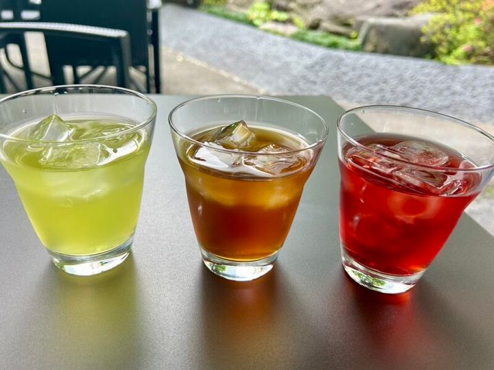 今年のビアガーデンの新作お酒メニューは、お茶とそれぞれのお酒の組み合わせを徹底的に研究して作ったそうです。写真左の「煎茶の茶割り 蒼」は煎茶の爽やかさが麦焼酎と相性抜群で、夏にぴったりの涼しげな味わいでした。中央の「ほうじ茶の茶割り 琥珀」は、ウイスキーと合わせることでほうじ茶の香ばしさが引き立ち、すっきりとした後味で食事にもぴったり。そして右の「和紅茶の茶割り 紅」は、華やかな香りの和紅茶とまろやかな梅酒が絶妙にマッチしています。色合いも可愛らしくて、私の一番のお気に入りです!
