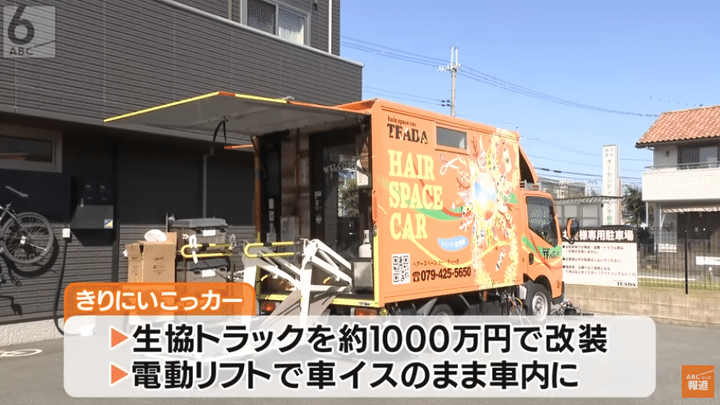 兵庫県加古川市で美容室「TEADA」を経営する安大陽平さん(45)が3年前に完成させた「きりにいこっカー」は、カット、シャンプー、カラー、パーマなど美容室のすべての施術がこなせる“走るヘアサロン”。生協の配達トラックを約1000万円かけて改装した車内は、電動リフトで車イスに乗ったまま入ることができるバリアフリー仕様だ。