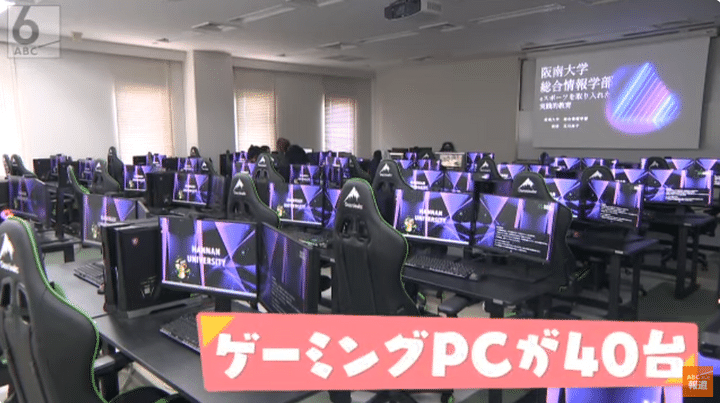 大仁田アナが訪れたのは、「OeGG」に参加している大学のひとつ、大阪・松原市にある「阪南大学」。ハイスペックなゲーミングPCがズラリと並ぶ教室では、「eスポーツを取り入れた実践的教育」と銘打った“ゲームの作り方”を教える授業が行われていた。