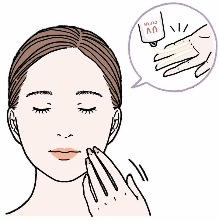 人差し指と中指にたっぷり日焼け止めを出したら、両ほお、額、あご、鼻に「5点置き」しましょう。その後、指をくるくる円を描くようにのばしていくと、肌にしっかり密着し、落ちにくくなります。また、紫外線は曇りの日や秋冬も降り注いでいるため、365日塗るのがマスト!