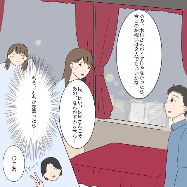 すると、「あの、木村さんがイヤじゃなかったら、今日のお祝いは2人でもいいかな」妹尾さんにそう言われ、「は、はい。妹尾さんこそ・・あの、なんかすみません・・」と謝りながら、「もう、ともか先輩ったら・・!」と心の中で呟く私。