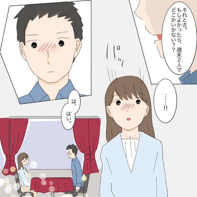 「それとさ。もしよかったら、週末2人でどこかいかない??」妹尾さんにそう言われて「・・・!!!」と驚いて思わず顔を上げた私は、「は、はい」と妹尾さんの目を見てそう言いました。