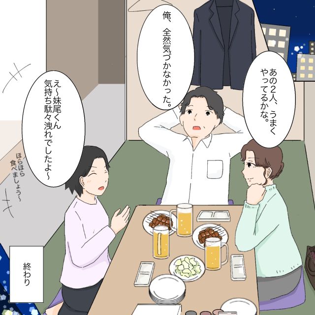 「あの2人、うまくやってるかな」そう呟くのは公佳さん。「俺、全然気づかなかった」と言う村岡さんに、「え~、妹尾くん気持ち駄々洩れでしたよ~」と笑うともか先輩。3人は居酒屋に集まって、ハルさんと妹尾さんの幸せな将来を想像していたのでした。