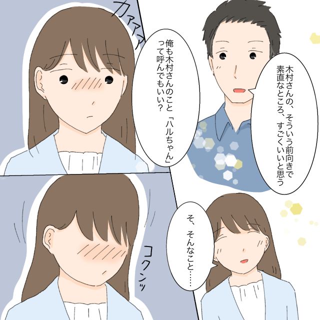 「木村さんの、そういう前向きで素直なところ、すごくいいと思う」そう言った後、「俺も木村さんのこと『ハルちゃん』って呼んでもいい?」妹尾さんにそう言われ、「そ、そんなこと・・」と呟きながらも頬がどんどん赤くなる私。思わず下を向いて「コクン」とうなずきました。