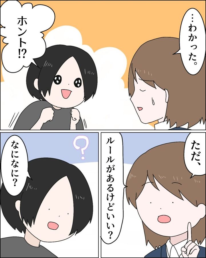 すでにフミヤは仕事を辞めてきてしまったのだから、今さら騒いだって仕方がない。私は覚悟を決めて「わかった。」と返事をしました。「ただ、ルールがあるけどいい?」最初が肝心。私は生活が変わってしまう明日からのルールを決めました。