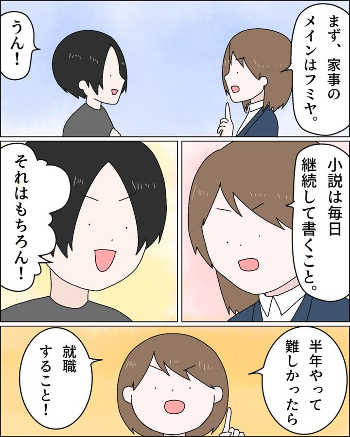 まず、家事のメインはフミヤ。結婚してから私が家事をしていましたが、明日から1日中家にいるなら、それくらいは負担してよね。フミヤは「うん!」と元気に答えました。それから、小説は毎日継続して書くこと。そして半年やってみて難しかったら就職すること!フミヤは3つのルールに同意しました。