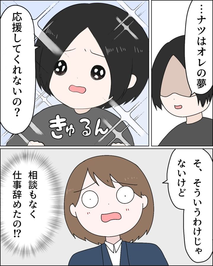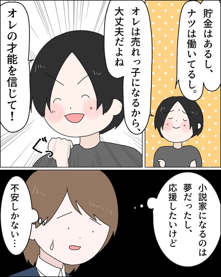 小説を書くことを専業とするために仕事を辞めてきたとサラリと言いのけた夫フミヤに絶句していた私。するとフミヤは「ナツはオレの夢、応援してくれないの?」と、澄んだ瞳で言うのでした。「そ、そういうわけじゃないけど」と言いながら、相談もなく仕事を辞め、無職になったフミヤを目の前にして、手放しで「そうだね、応援するよ!」なんて言えませんでした。