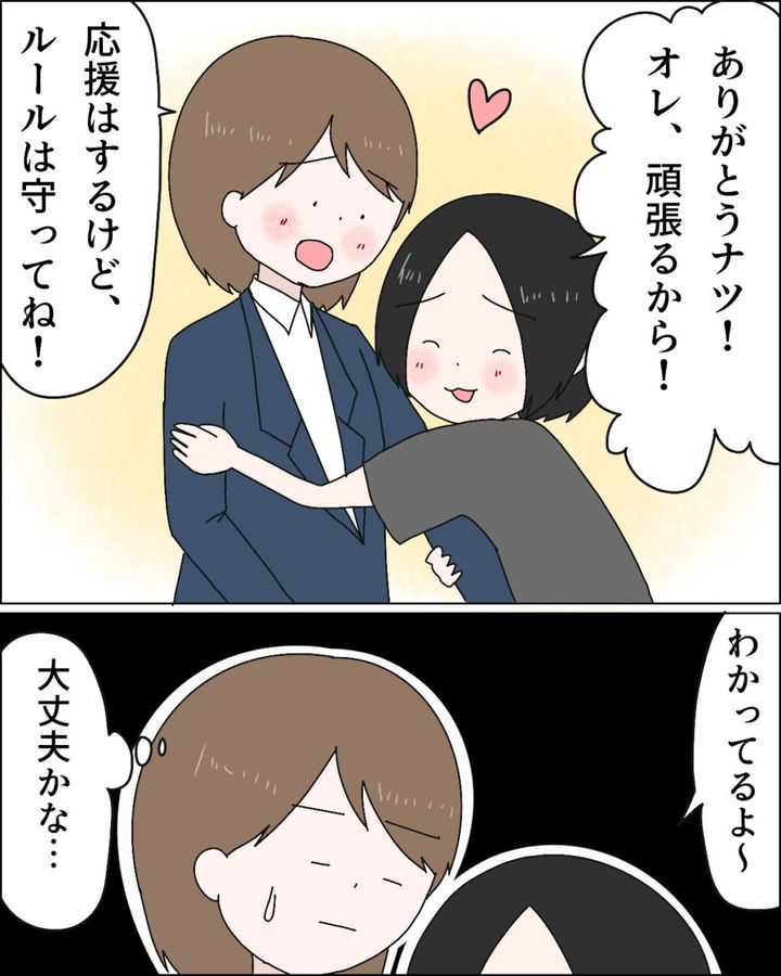 「ありがとうナツ!オレ頑張るから!」フミヤは嬉しそうに飛びついてきました。「応援はするけど、ルールは守ってね。」とてもじゃないけど、フミヤのように希望に満ちた顔なんてできませんでした。「わかってるよ~」と簡単に言っているフミヤに「大丈夫かな」と、やっぱり不安しかありませんでした。