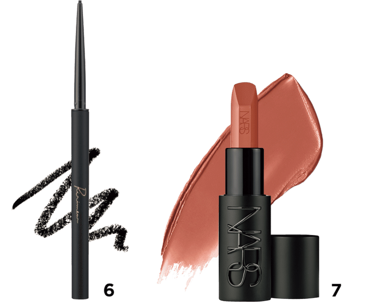 「上の目尻だけ、6のライナーで太めにラインを描く。リキッドよりもペンシルの方がカジュアル見えします。リップも少し赤みのあるベージュを選んで、気持ち華やかに」 6 リリミュウ ソフトクレヨンライナー 01 ブラック ¥1,430(コージー本舗)、7 エクスプリシット リップスティック 801 ウォームベージュ ¥5,280(NARS JAPAN)