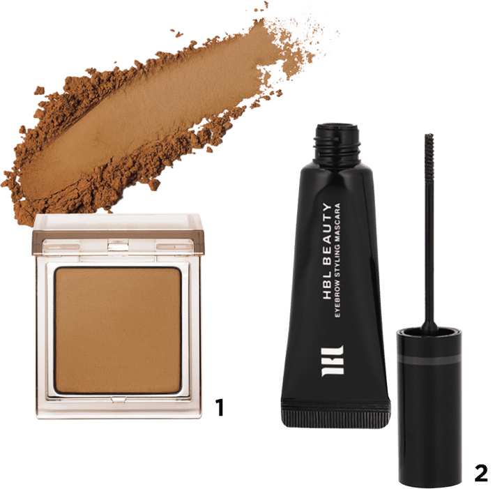 「目元はマスカラもつけず、まぶた全体に1のアイシャドウを塗るだけ。眉は2の透明感のあるクリアブラックのマスカラで毛流れを整え、存在感を出します。眉がない人はパウダーやリキッドで描き足してからマスカラを」(中山さん、以下同) 1 インフィニシェイド シングル アイシャドウ(レフィル)03 サンリット スウェード ¥2,530 ※別売り カスタムケース ¥550(共にRMK Division)、2 アイブロウ スタイリングマスカラ 02 クリアブラック ¥3,960(HBL BEAUTY)