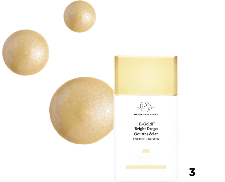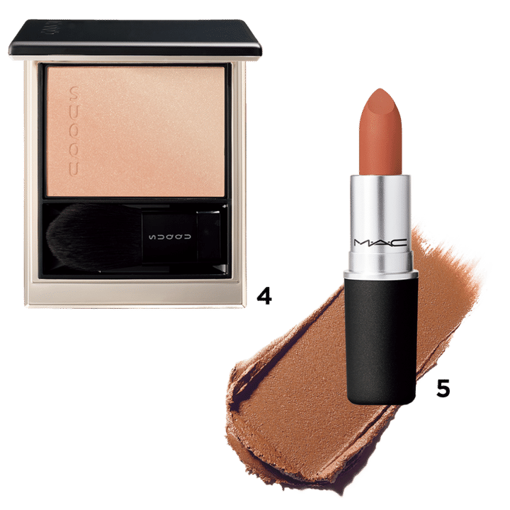 「下地としてもハイライトとしても使える3の美容液をベースに。肌に程よくツヤ感が出てオススメ。チークは4をブラシに取り、頰の高い位置から外側に、少し上を意識してのせる。ベージュのリップを塗るときは、コンシーラーで唇の色をおさえてから塗ると◎」 3 ドランク エレファント ビーゴールディ ブライト ドロップス 31.2g ¥5,280(ドランク エレファント)、4 ブラーリング カラー ブラッシュ 02 陽照-HARUTERASHI ¥6,600(SUQQU)、5 パウダー キス リップスティック インパルシブ ¥4,070(M・A・C)