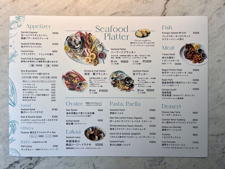 大皿にたくさん載ったシーフードをみんなでシェアするスタイルのシーフードプレートメニューから前菜、パスタ、お肉、お魚などバリエーション豊富なメニューになっていました。