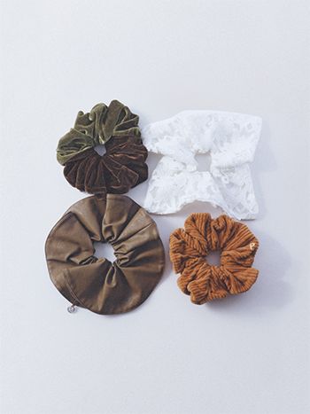 〈右上から時計回りに〉ホワイトレースシュシュ 6,600円/MARTE ブラウンコーデュロイシュシュ 5,390円/POTETE レザーシュシュ 3,300円/アダム エ ロペ カーキ×ブラウンベロアシュシュ 5,390円/POTETE