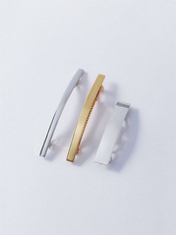 〈左から〉シルバーバレッタ 1,980円/アネモネ(サンポークリエイト) ゴールドバレッタ 9,900円/IRIS47(フーブス) 幅広シルバーヘアピン 17,600円/ノース ワークス(UTS PR)