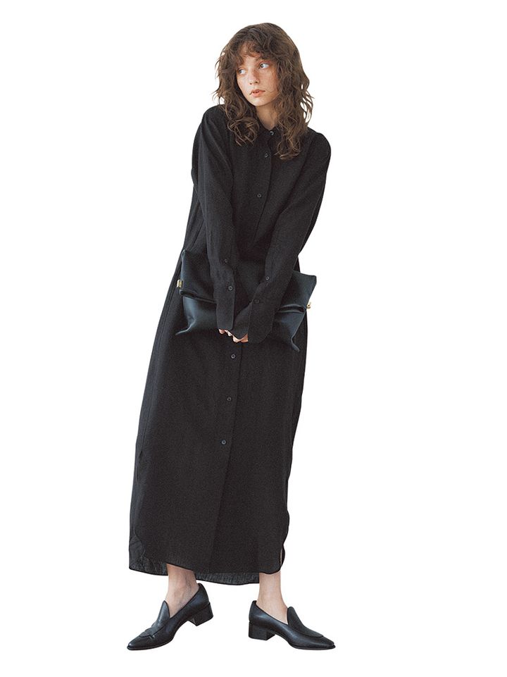 ほがらかなリネンをモードに傾ける長めの着丈。素材特有のシワ感がありながらも気品をまとえる、微光沢な黒。素材自体に表情があるから、1枚でさらっと着るだけでさまになり、ボタンを上まできちんと閉めることで、ルーズなシルエットも知的に好転。