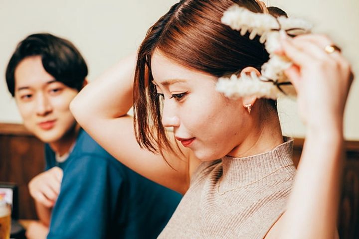 おろしていった髪は飲み会の後半戦ではひとまとめにするのが沼らせ上手の必殺技。しばる仕草込みで見せるのがポイント。