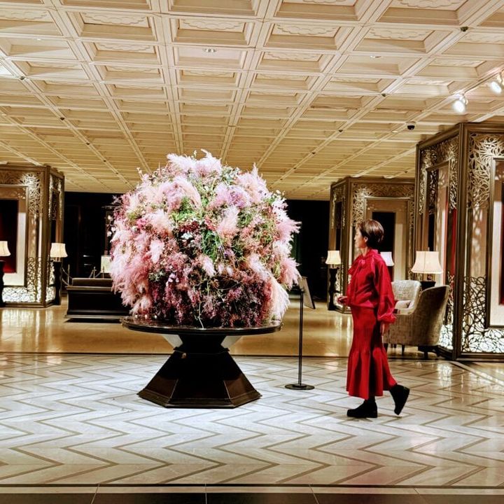 東京プリンスホテルのロビーには、ひときわ目をひく美しい花の装飾が。実はこれ、「ロスフラワー(本来は廃棄される予定だった花)」を使ったサステナブルなデコレーションなんです。説明を読むまで、ホテルのゴージャスな装花だと思っていました。環境配慮と共存している様子、美しく、心に響く空間演出です。