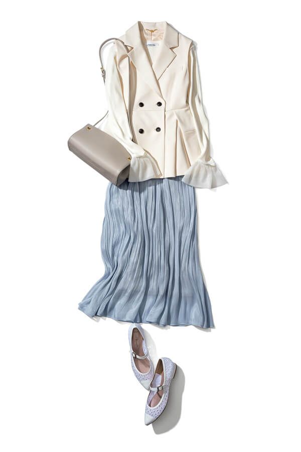 動くたびにツヤめく上品なサテンスカート。端正なジレを合わせればONシーンもおまかせ。