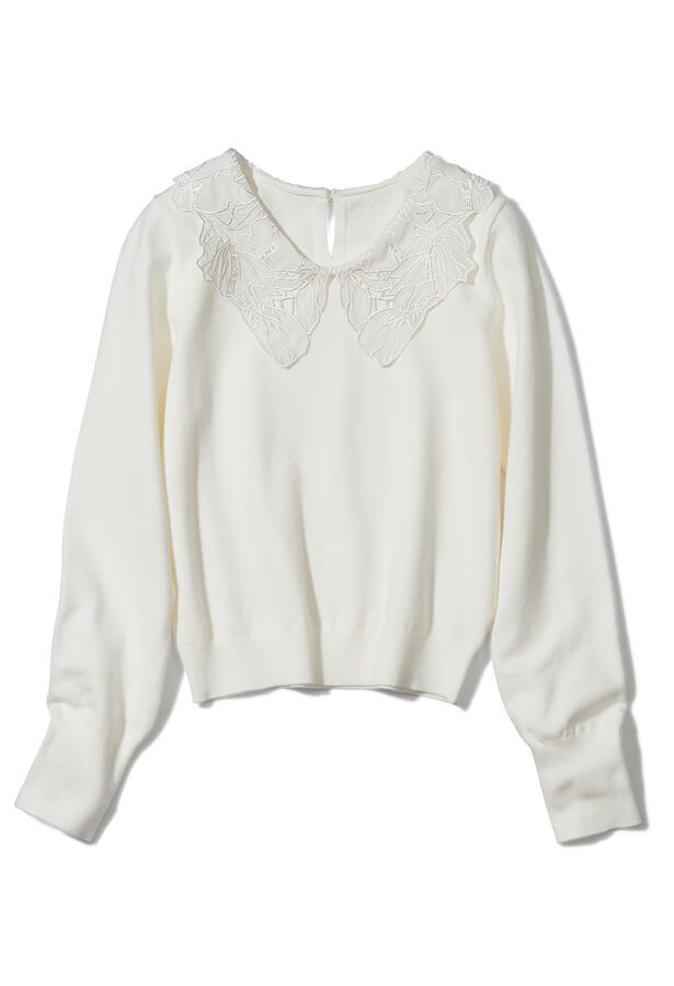 大きめのフラワーレースならハリのある体形にもぴったり。ゆったりとしたUネックで首詰まり感も回避。さらにレースえりのVのW効果ですっきりと。