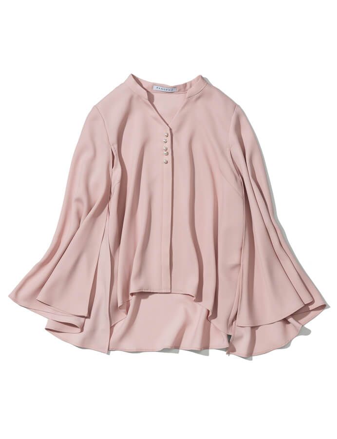 すっきり見えるVネック、二の腕をカバーするケープ袖、お尻が隠れる長め裾と骨ストにうれしいデザイン。
