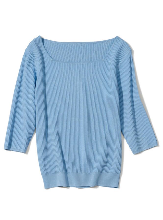 メリハリボディを引き立ててくれるシンプルニットは、繊細なラメ入り。上半身の厚みを生かしたスクエアネックで華奢見せ。