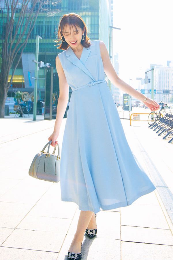 カシュクール風の襟が女性らしさと気品に溢れる1着。フィット&フレアを作り出す細ベルトもオフィスシーンに品よくマッチ♡