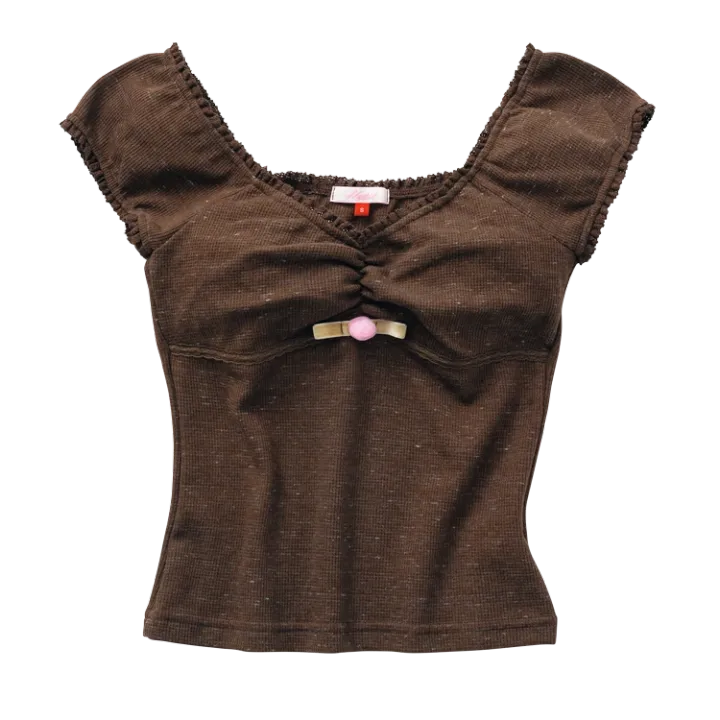 シンプルながら、ブラウンのシックさと、デコルテあきの女みを兼ね備えた無敵トップス。胸元のバラがアクセント。