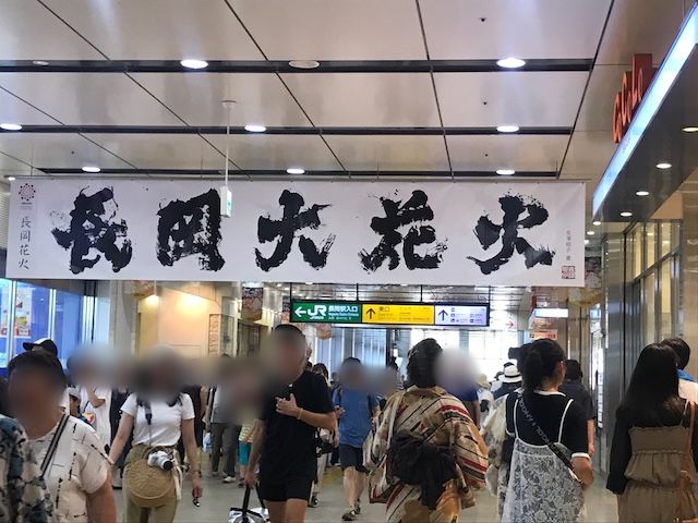 ツアーや自車以外の場合、長岡花火の後、新幹線でギリギリ東京へ帰ることもできますし、宿泊することも可能ですが、どちらも茨の道なのは覚悟してください。新幹線の場合、筆者の過去参戦した経験だと、少し早めに出ないと新幹線に乗ることができません。それは仮に新幹線の席を確保していたとしても、そもそも混雑で駅に辿り着けないのです!