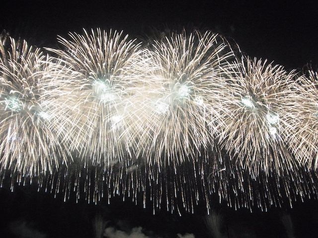 2004年の中越地震復興を願って始まったプログラム。平原綾香さんの「Jupiter」の音楽に合わせて、花火が完全にシンクロし、5分以上にわたる大演出が繰り広げられます。約2kmに及ぶ幅で打ち上げられ、他で見ることはできないであろう圧倒的なスケール! 花火の種類は超ワイドスターマインで3社に分かれて打ち上げられているそうです。
