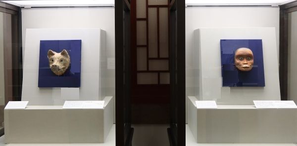 右、《狂言面 猿》 江戸時代・17-19世紀 有馬伯爵家旧蔵、左、《狂言面 狐》 江戸時代・18世紀 有馬伯爵家旧蔵 どちらも大倉集古館蔵